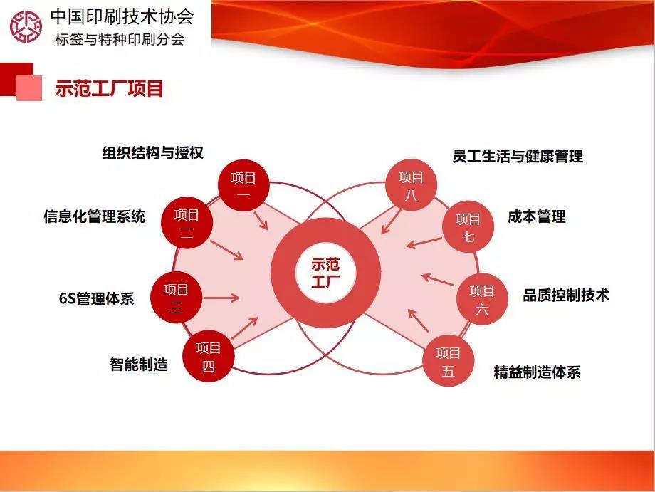 然后,胡德軍秘書長重點介紹了全國示范工廠項目。從組織結構與授權、精益制造體系、品質控制技術等8個方面對企業工廠進行升級改造,打造企業內功,為其區域內的會員單位提供示范作用。