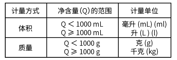 液態食品,用體積升(L)(l)、毫升(mL)(ml),或用質量克(g)、千克(kg);固態食品,用質量克(g)、千克(kg);半固態或黏性食品,用質量克(g)、千克(kg)或體積升(L)(l)、毫升(mL)(ml)