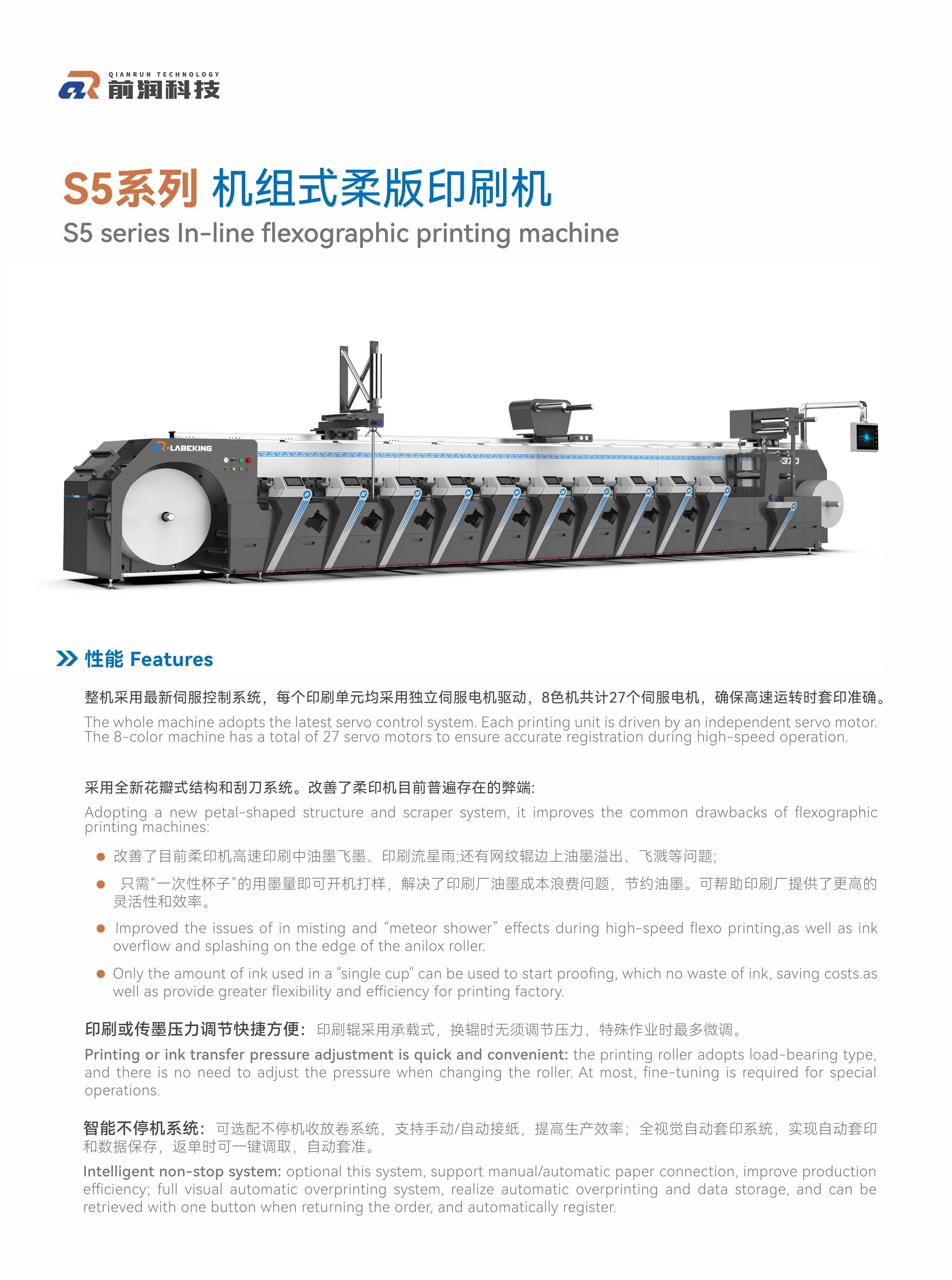 5??多功能印刷: 柔版印刷為主,支持冷燙、覆膜、除膠、多層標簽、折頁標簽、在線品檢、模切等工藝,可選配絲印、噴碼、凹版等聯機功能。